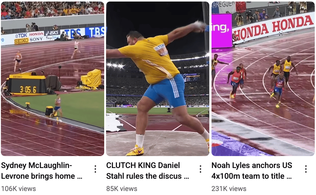 Purpose: These are designed for discoverability, searchability, and shareability. Fans of a specific athlete or event will search for these clips directly (e.g., "Sydney McLaughlin 400m final"). They fuel discussion and are easily embedded on social media or in news articles.