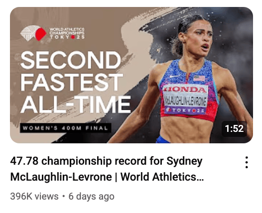 Strategic Purpose: This video targets a specific audience: fans of Sydney McLaughlin-Levrone and those interested in track and field records. It's highly searchable for terms like "Sydney McLaughlin record" or "400m final Tokyo." By creating a separate video, they give this incredible achievement its own spotlight, maximizing its potential to be shared across social media and embedded in news articles. The 396K views show the high interest in these specific, historic moments.
