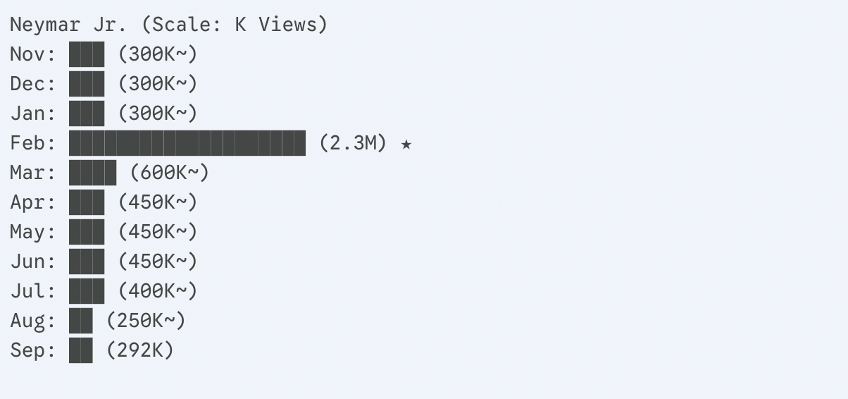 Neymar Jr.'s channel outside of the February peak shows very low, flat viewership, whereas Santos maintains a high baseline throughout the year.