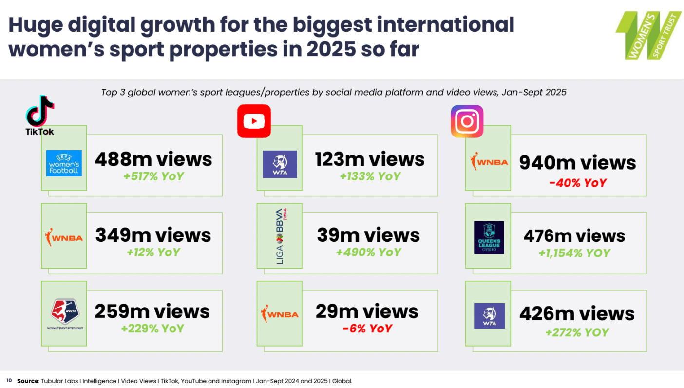 Takeaway: Women’s football is the most mature digital ecosystem and the clearest proof that women’s sport is now a global creator category.